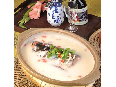 選用特別訂制的江蘇宜興魚頭紫砂砂鍋,將魚頭下鍋煎黃后撈出,放入砂鍋,注入天目湖水,輔以蔥結、生姜、料酒、香醋、香菜、胡椒等,撇除浮油,在火上煨煮數小時,一道白里透紅,細嫩無比,鮮美絕倫的天目湖砂鍋魚頭就可以上桌了。