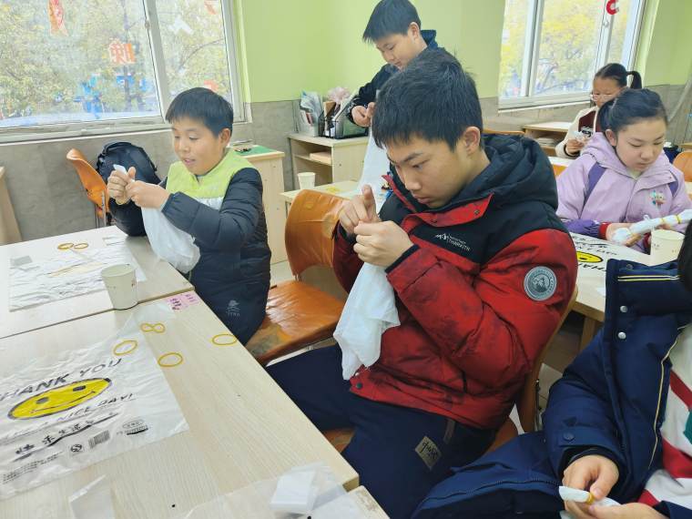 完成扎結后,小組共同調配染料,將扎好的布料放入染缸進行染色。在染色過程中,青少年可以觀察布料顏色的變化,根據自己對顏色的需求掌握染色時間。染色完成后,進行清洗、拆線等后續操作,最后將作品掛在指定區域晾干。
