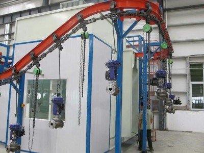 工件通過輸送鏈進入噴粉房的噴槍位置準備噴涂作業。靜電發生器通過噴槍槍口的電極針向工件方向的空間釋放高壓靜電(負極),噴槍口噴出的粉末和壓縮空氣的 混合物以及電極周圍空氣電離(帶負電荷)。工件經過掛具通過輸送鏈接地(接地極),這樣就在噴槍和工件之間形成一個電場粉末在電場力和壓縮空氣壓力的雙重 推動下到達工件表面,依靠靜電吸引在工件表面形成一層均勻的涂層。